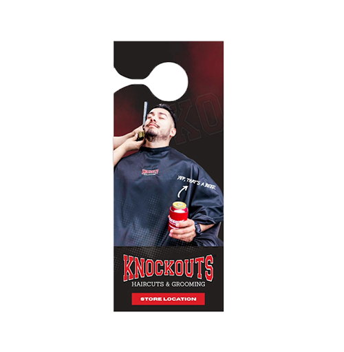 Customizable Knockouts door hangers with a perforated tearaway coupon—perfect for local marketing drops or neighborhood outreach.