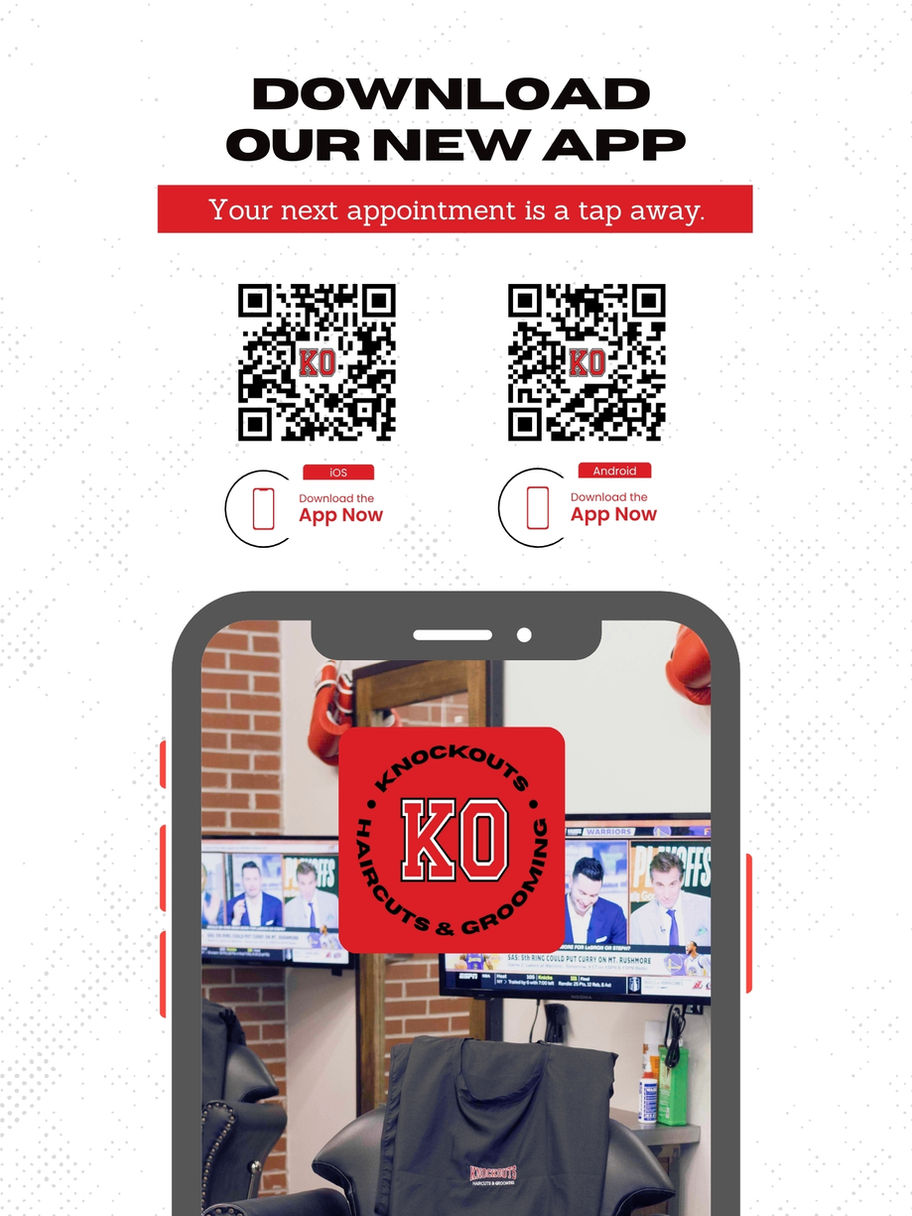 Sleek, high-impact table tents make it effortless for clients to download the new Knockouts Haircuts App while they wait. Just set them up and let the QR codes do the work—one scan and they’re in.